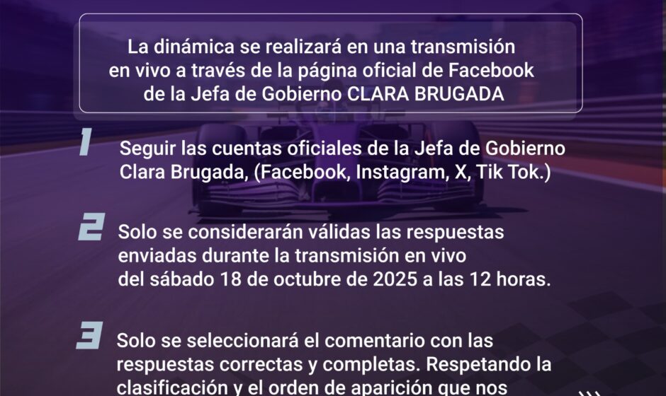 La jefa de Gobierno de la Ciudad de México, Clara Brugada, anunció este viernes a las 23:00 horas, una dinámica para que la población pueda ganarse uno de los 550 pases dobles para asistir a la Fórmula 1, que se llevará a cabo del 24 al 26 de octubre.
