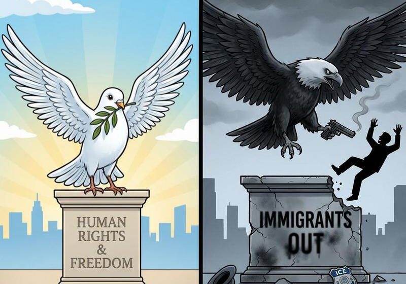 AlcaldiasNews 12 de febrero de 2026 0 2 (Multimedia) Viñeta: Dos caras Ideal vs. Realidad: Las dos caras de los derechos humanos en Estados Unidos